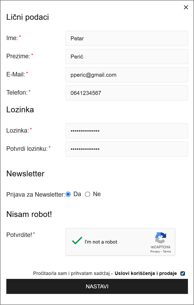 U prozoru za unos informacija o kupcu, unesite svoje podatke. Minimalan broj karaktera za lozinku je četiri. Savetujemo vam da za kreiranje što sigurnije lozinke koristite kombinaciju velikih slova, malih slova i brojeva. Kako biste bili u toku sa svim aktuelnim dešavanjima i popustima, pozivamo vas da se prijavite na naš newsletter. Kada završite sa unosom podataka, nakon potvrde da "Niste robot" i naše "Politike privatnosti", klikom na dugme "NASTAVI" proces registracije je završen. Nakon toga će vam sistem na E-Mail adresu koju ste uneli, poslati E-Mail dobrodošlice sa linkom za prijavu.
